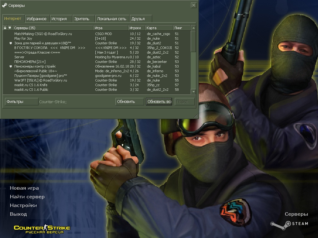 Counter Strike 1.6 – это одна из самых популярных сетевых компьютерных игр на сегодняшний день. Игра командная, поэтому все игроки разбиты на два враждующих лагеря – террористы и спецназ. Цель достаточно проста – уничтожить команду соперника. В игре можно выбрать не только команду, но и карту игры. Если вы хотите найти подходящий сервер по вашим парметрам, тогда одним нажатием скачайте наш игрокой клиент и выбирате функцию Find Servers для поиска. Вашему вниманию будет представлена таблица с различными разделами. Internet – это возможность игры через интернет, а Lan– это игра по локальной сети.